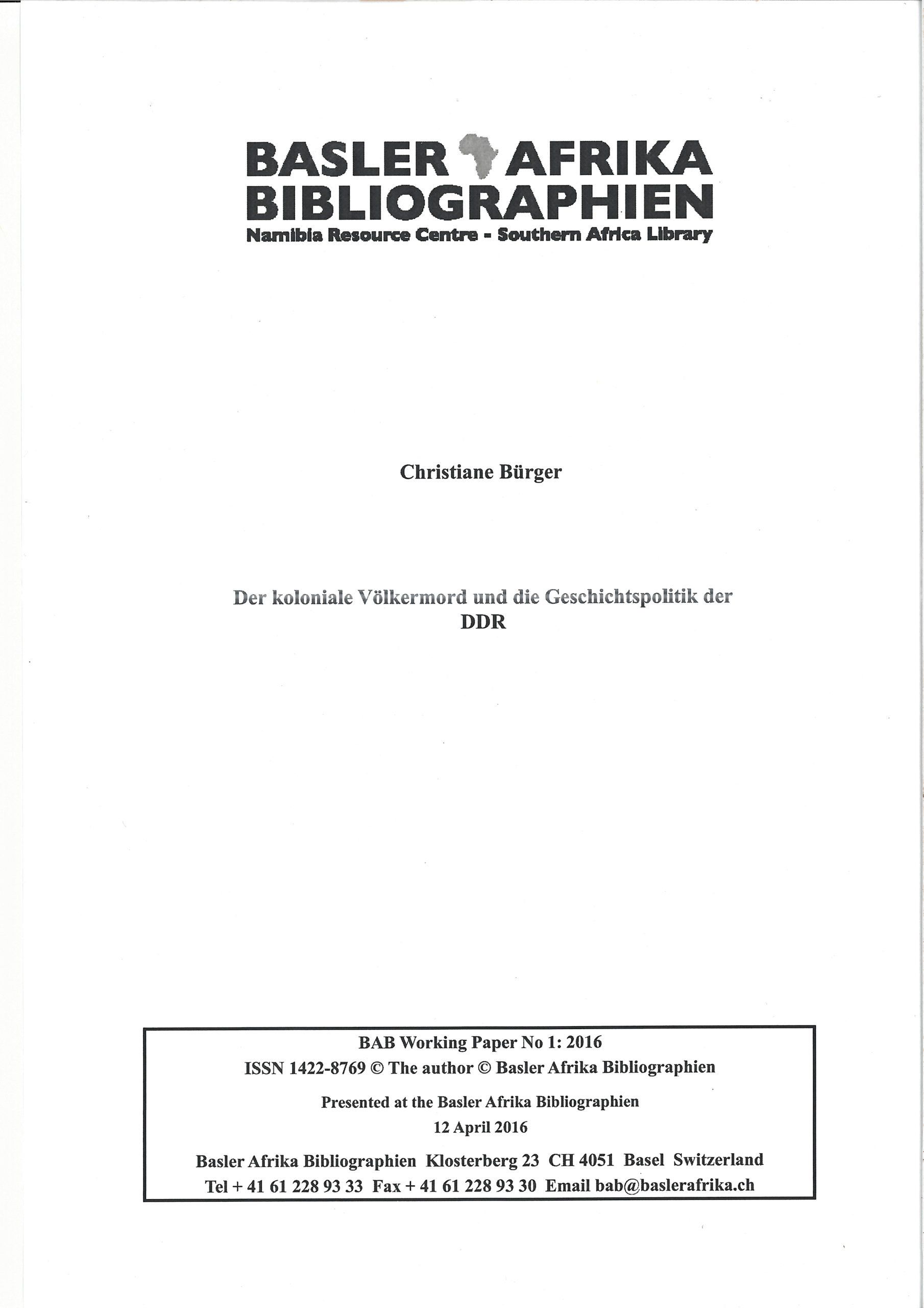 The German historian Christiane Bürger gave a presentation in one of the BAB’s Research Colloquiums in 2016 on the colonial genocide in Namibia and history politics in former East Germany. Her presentation was published (in German) in the BAB Working Paper Series (No 1: 2016) and is available through the Open Access site of the BAB Publishing House.